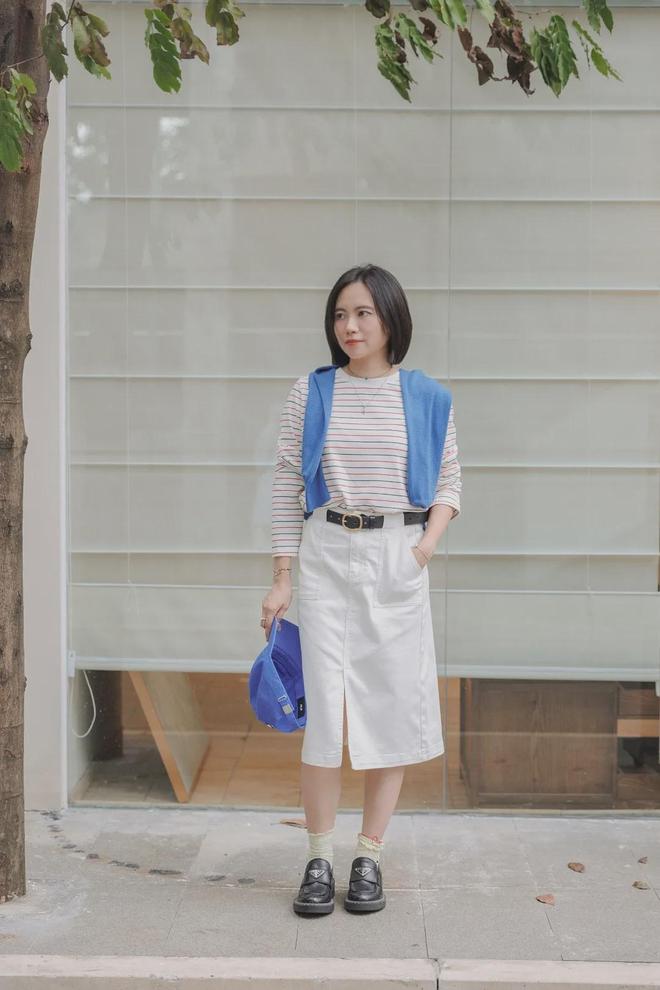 白色牛仔半裙是这两年才真正get到的单品。原来总觉得这种过膝的直筒牛仔半裙太板正了,穿起来容易严肃老气。