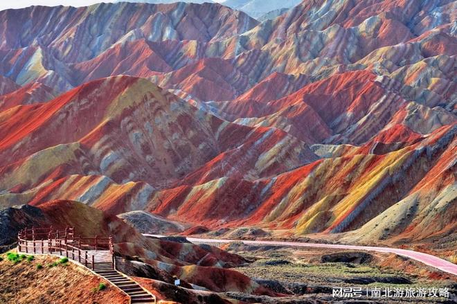 D2天:七彩丝路——丹霞与张掖清晨出发,大巴沿着祁连山脉行驶,婷婷一路讲解丝绸之路的驼铃声与商队故事。抵达丹霞口小镇,仿古建筑的市集里,手艺人现场制作敦煌壁画纹样的陶器,她教我们识别丹霞地貌的层理结构。张掖七彩丹霞景区,赤红、金黄、青灰的岩层如上帝打翻的颜料盒,婷婷指着“七彩屏”说:“这里每一寸岩石都是两亿年的时光沉淀。”晚上赠送的《回道张掖》演出,丝路驼队、胡商舞娘重现历史,灯光与舞美震撼人心。